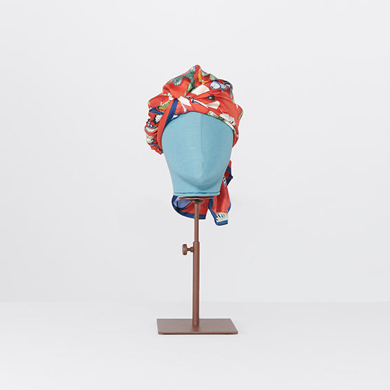Vita turban crafted from a 90x90 cm carré in silk twill.