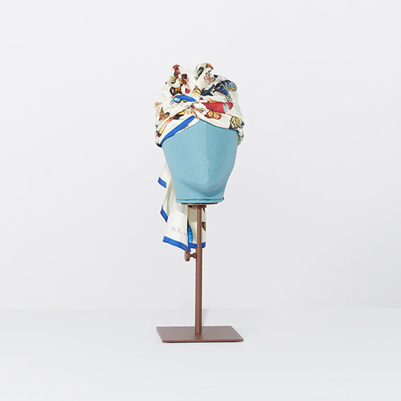 The turban is made from Mantero's core product, the 90x90 carré, and is cut in the middle creating two flounces and curled and tightened with a round elastic on one side. The result is a fabric that can be tightened and discretely or extravagantly knotted, according to one's style and mood.
