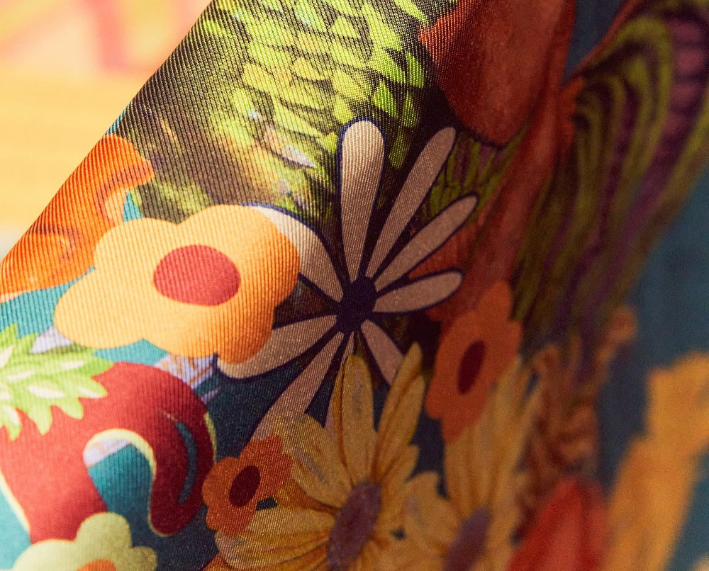 Una disegnatura classica viene sdrammatizzata da un soggetto divertente come il gallo e abbinata a fiori estivi, per un effetto leggero, giovane e grintoso. Il gallo aggiunge un elemento di sorpresa e allegria, mentre i fiori estivi conferiscono freschezza e vitalità.